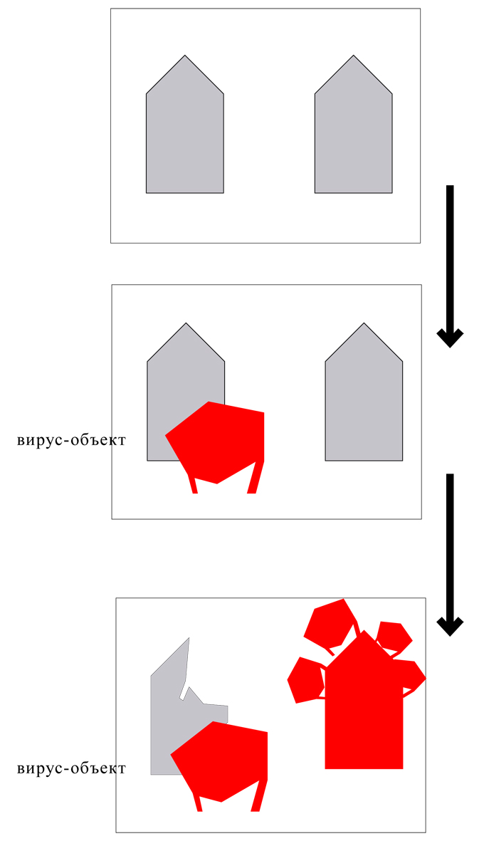 Вирус-объекты – это пространственные средовые объекты, которые привлекают внимание за счет во-первых (1) контраста окружению, во-вторых (2) необходимой функции, в-третьих (3) интриги, то есть так или иначе вызывающие коммуникацию и обновляющие городскую застройку. Вирус-объект представляет собой вирус до тех пор, пока сам не станет гомогенным, привычным и занимающим основную массу видимого пространства, идентифицирующимся людьми как «нормальный» объект или «нормальное» пространство.