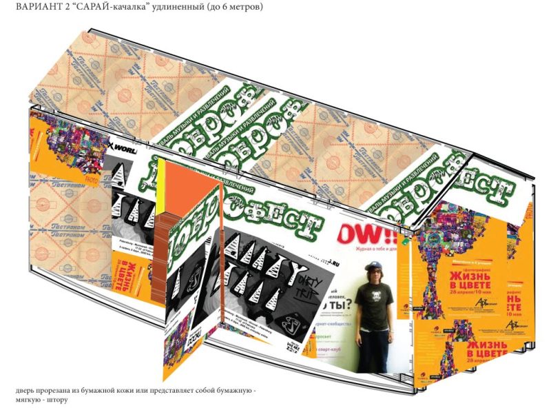 Для легкости конструкции размеры объекта (вариант 1) минимизированы 280(д)х200(ш)х200(в). Основная деталь конструкции – фигурная доска (спил по дуге) крепится к основанию. Эта деталь позволяет создать ощущение нестабильности и неустойчивости в сарае. Объект оснащен сидениями и поручнями с целью избежания падения. Деревянный каркас сарая оклеен плотной бумагой – старые афиши, плакаты, оберточная и прочая бумага, использованная баннерная ткань. На таком фасаде можно рисовать, его можно прорывать и “подсматривать” за окружающим миром.