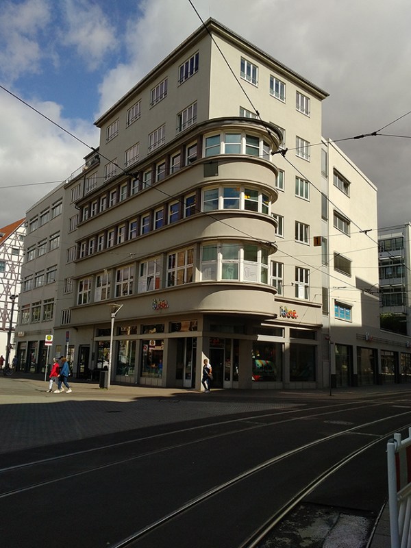 Erected in 1929, broken the Building Law regarding height restriction of max 18m (height 21 m), the former shop of the 1920s “Textilgeschäftshaus Schellhorn”, and later former Poliklinik Mitte – Das Haus des Deutschen Handlungsgehilfen-Verbandes (DHV) am Anger 81 – The house of the German Trade Aid Association – is reconstructed in 1999 and assigned as Heritage. Architect – Heinrich Herrling (inspired by Erich Mendelsohn’s Kaufhaus Petersdorf in Wroclaw). Построенная в 1929 году, нарушившая Строительный закон относительно ограничения по максимальной высоте в 18 м (высота 21 м), бывший текстильный магазин Шеллхорн, потом – бывшая центральная поликлиника – Das Haus des Deutschen Handlungsgehilfen-Verbandes (DHV) am Anger 81 – дом Немецкой ассоциации торговой помощи – реконструирована в 1999 году и отнесена к объектам наследия. Архитектор – Хаинрих Херрлинг (был вдохновлен Мендельсоновским магазином Петерсдорф в Вроцлаве).