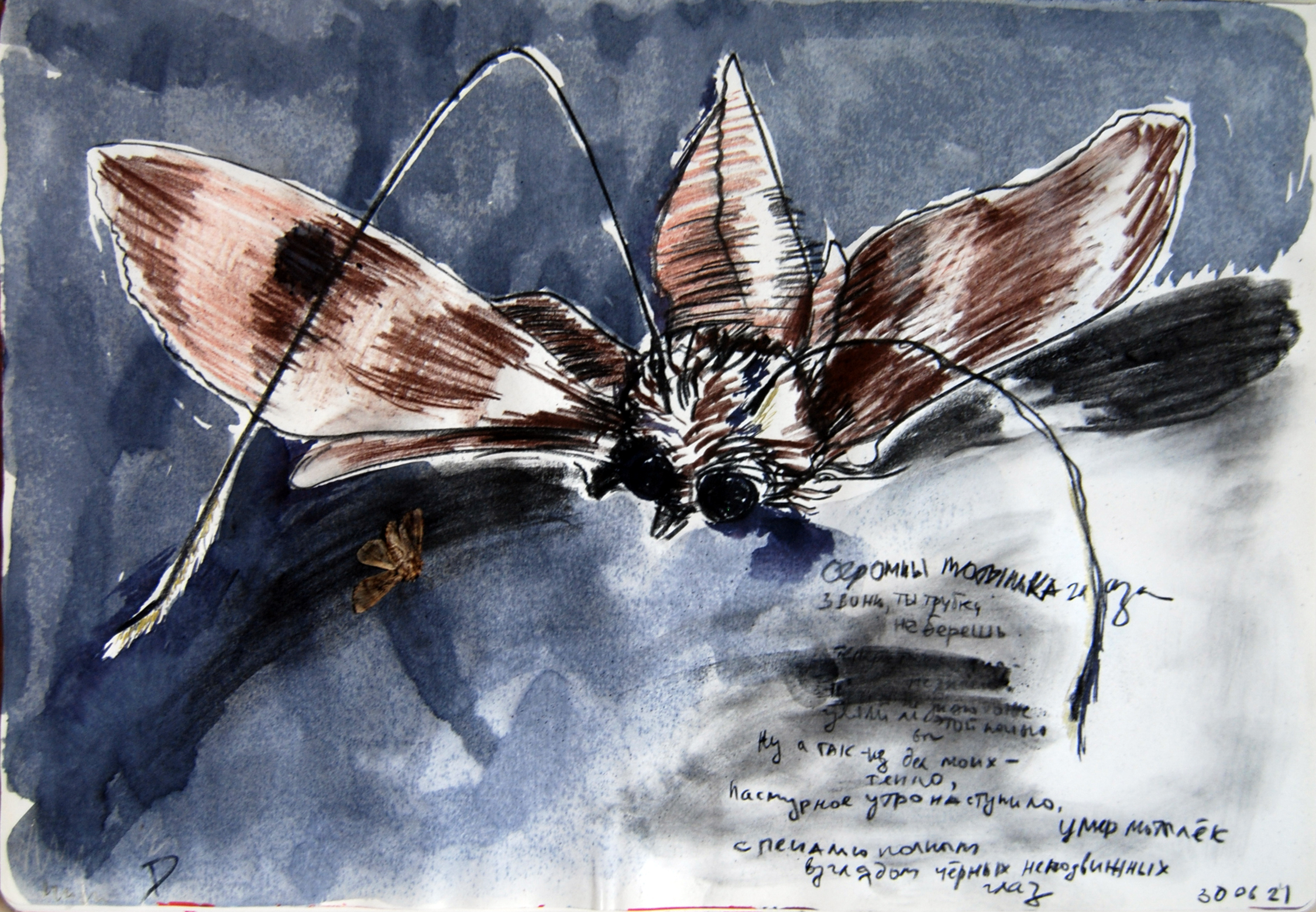 Date: 11/07/2021Author: reshett Category: Artwork, Drawing Tags: big eyes of the butterfly, charcoal, Drawing, графика, мотылек, graphic, Ink, moleskin, moth, сепия, стихотворения, уголь, poem, sepia, Tinte